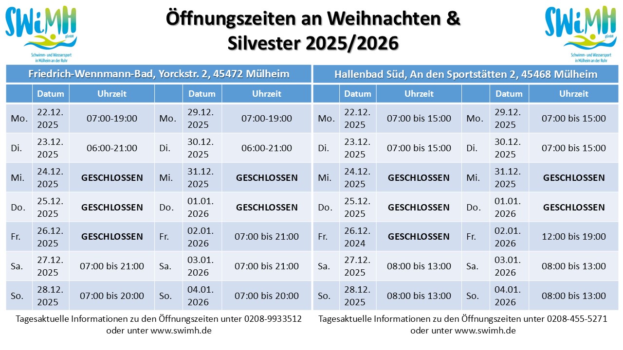 In den Weihnachtsferien haben das Friedrich Wennmann Bad und das Hallenbad Süd vom 24.12.-26.12.2025 , sowie am 31.12.2025/01.01.2026 geschlossen.